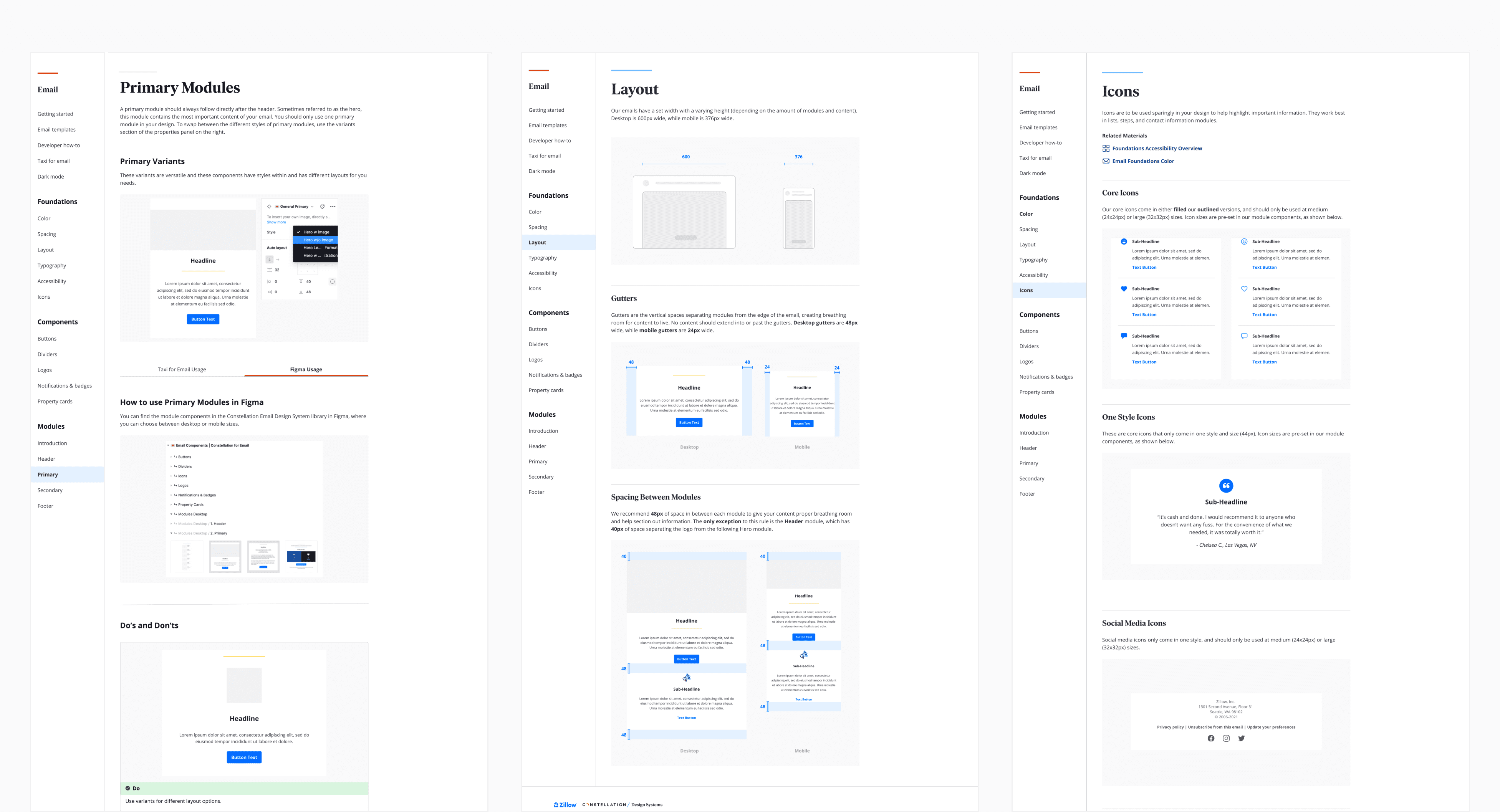Documentation for Constellation Email Design System: Primary Modules, layouts and icons for mobile and desktop.