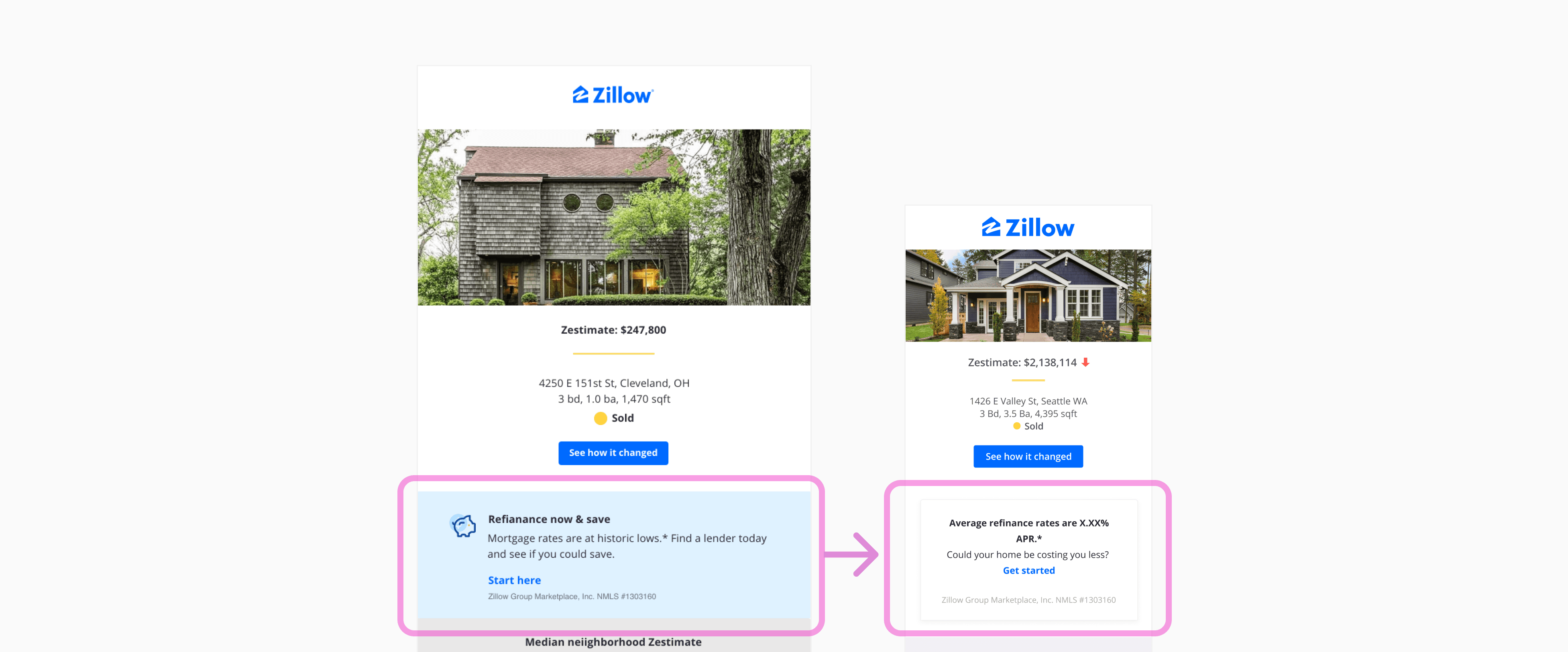 Updated refinance advertising module for Zillow Group Marketplace in the Home Owner Report email, utilizing updated typography, spacing and color.